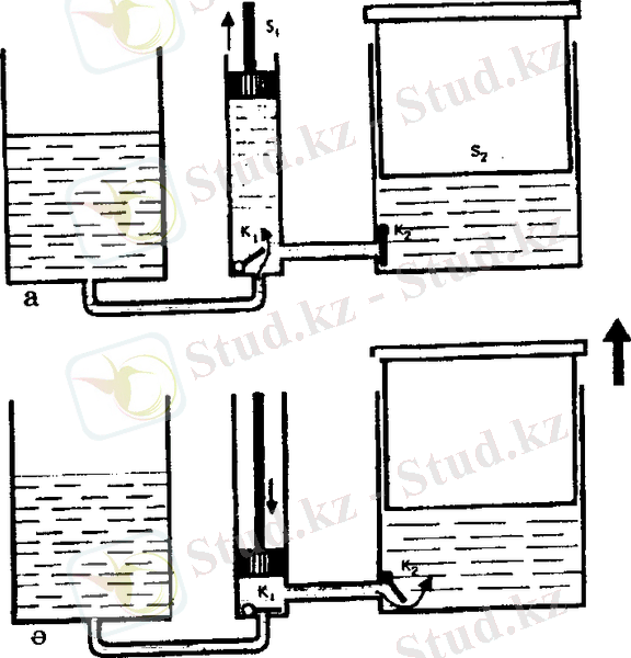 Поршень төмен қарай қозғалғанда (4, ә- сурет) К1 жабылады, ал К2 қақпағы ашылады да сыртқы күш тудырған р қысымының әсерімен май цилиндрге өтеді, цилиндрде де р қысымы пайда болады. Сыртқы поршенінін майға әсер ететін күші F1=pS1, ал майдың үлкен цилиндрдегі поршеньге