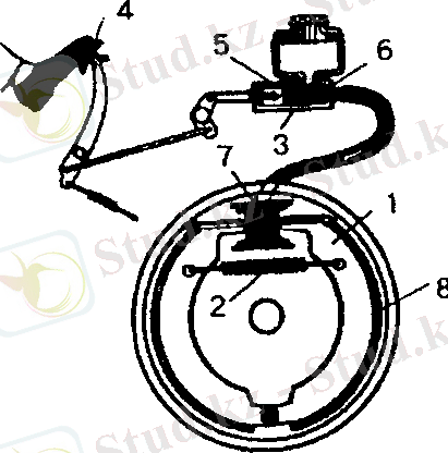 5-суретте сондай гидравликалық тежеуіштің құрылым нұсқасы көрсетілген . Әдеттегі күйде доңғалақтағы 1тежеуіш қалыптар 2 серіппемен тартылып тұрады, серіппе цилиндрдегі майдың азғантай қысымын теңестіреді. Тежеу кезінде жүргізуші 4 тежеуіш тетікті басады. 5 тартқышпен 6 поршень майға қысым түсіреді, май ол қысымды 7 тежеуіш цилиндрді де орналасқан поршеньдерге береді. Поршеньдер 8 тежеуіш қалыптарға қысым түсіреді.