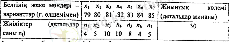 X Белгінің қабылдайтын әрбір жеке мәнін х 1 , х г , . . . , х п деп белгілейміз (біздің мысалымызда 83, 85, 81 т. с. с. ) сонда олар әрбір варианттар, ал әрбір варианттың қанша рет кездесетінін көрсететін абсолютты сандар, олардың жиіліктері деп аталады. Жиіліктер п 1 . п 2 , . . . , п т деп белгілінеді. Белгінің жеке мәндерін (варианттарды) өсу немесе кему ретімен орналастырып, жөне әрбір варианттың қанша рет кездесетінін көрсетсек, онда белгінің таратылуы немесе вариациялық қатар келіп шығады.
