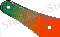 (Направление перетекания) өрісінде перетеканияның аралық сатыларының еңкею бұрышы анықталады. Ол градус бойынша беріледі. Егер, мысалы 150° шамасын енгізсек, онда перетекания сатылары басынан соңына орналасады, яғни соңғы аралық саты соңғы объектіге қатысты 150° градусқа ашылған. 9 суретте еңкею бұрыштарының әртүрлі мәндері көрсетілген. Сатылар еңкеюі объект перетеканиясының айналу центріне байланысты орындалады, соның ішінде соңғысына қатысты. Объектіні белгілеп, айналу режиміне өтіңдер және ценрге орналастырыңдар. Осы арқылы перетекания түрі өзгеріледі.