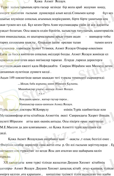 деп Ахмет Яссауи тек насихатшасы емес ХІІ ғасырда өмір сүрген философ, ұлы ғұлама мейірімді кішіпейіл ойшыл ақын ретінде түрік жұртына танымал болды.