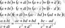 - Қосу, көбейту, алу және бөлу. a+biтүрінде жазылған комплекс сандарды қосу, көбейту, алу және бөлу төмендегіше орындалады: