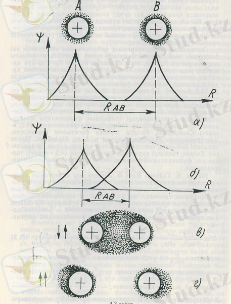 Системаның толық энергиясы әрбір атомның энергиясын екі еселегенге тең. Күнделікті өмірде сутегі молекуласы орнықты система екенін білеміз, яғни ядролары белгілі бір R АВ ара қашықтығында орналасқан. Атомдар бірігіп орнықты система құрайды, электрондары ортақтастырылған. R АВ ара қашыкдығында әрбір атомның толқындық функциясы кеңістікте бір-бірін жабады (3, б-сурет) . Егер екі пара-пар бөлшектердің (біздің жағдайымызда электрондардың) толқындық функциялары кеңістікте бір-бірін жабатын болса, екі мүмкін күйі болады. Бірінші, спиндері антипараллель бағдарлағанда электрондардың толқындық функциялары молекуланың орталық, аймағында көбірек концентрацияланған (3, в-сурет) . Спиндерінің бағыты стрелка бағытымен көрсетілген. Электрондардың кванттық сандары n, l, m бірдей де, Паули принципі бойынша, спиндері бір-біріне қарама-қарсы бағдарланған. Екінші, спиндері параллель бағдарланған (3 г-сурет), толқындык функциялар системаның шеткі аймақтарына концентрацияланған.