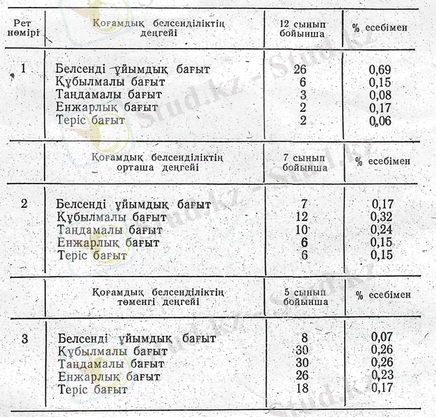 Оқушылардың қоғамдық жұмыстардағы белсенділіктерінің деңгейін зерттеп, жинақталған қорытындысын төмендегі кестеде көрсетіп отырмыз.