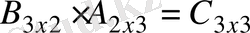 көбейтіндісі жоқ, себебі бірінші матрицаның тік жолдар саны екінші матрицаның жатық жолдар санына тең емес;