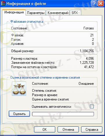 Көрсетілген әрекеттердің орындалу нәтижесінде мұрағаттаушы әр түрлі әдістермен ерекшеленген файлдық объектінің қысылу дәрежесін, сонымен қатар мұрағаттаудың орындалу I уақытын шамамен бағалайды. Бағалаудың нәтижесі «Файл туралы ақпарат» («Информация о файле») терезесінде бейнеленеді. Мұндай терезенің мысалы 4. 3 суретте келтірілген. Бұл терезеде мұрағатталатын файлдардың саны және олардың жалпы ұзындығы, сонымен қатар қысылу дәрежесінің сандық пен сапалық бағасы көрсетіледі. Терезеге шығарылған нәтижелер туралы қосымша ақпарат алу қажет болған кезде «Анықтама» («Справка») батырмасы бойынша шерту керек, ал тереземен жұмыс істеу «Жабу» («Закрыть») батырмасының көмегімен аяқталады.