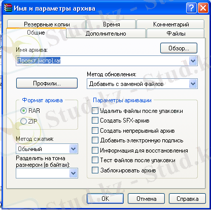 Бағалау іс-әрекеті орындалғаннан кейін мұрағаттық файлды әзірлеуге кірісуге болады. Ол үшін аспаптық тақтадағы «Үстемелеп қосу» («Добавить») батырмасында шерту, Alt+A пернелерінің қисынын пайдалану немесе мұрағатқа Файлдарды үстемелеп қосу > Командасын (Команды > Добавить файлы) таңдау керек. Нәтижесінде экранға мұрағаттау режімдерін орнату терезесі мен мұрағаттың параметрлері шығарылады (4. 4 сурет) .