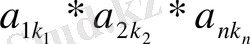 алалық. Бұл матрицаның элементтерінен әрбір жолдан бір және әрбір бағаннан бір ғана элемент болатындай барлық мүмкін көбейтінділерді құралық. Әрбір көбейтіндідегі көбейткіштер саны п , сондықтан оларды бірінші индекстері (1, 2, . . . , п ) ауыстыруын сақтап орналастыруға болады. Сонда көбейтінді