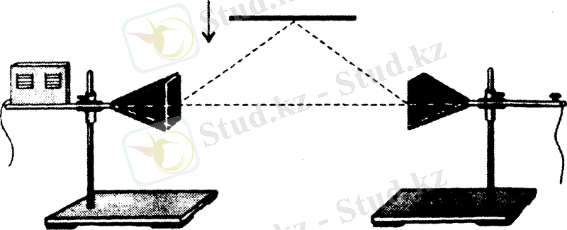 Электромагниттік толқындардың шағылуы егер диэлектрикті металл пластинкамен алмастырылса, онда дыбыс естілмей қалады. Шағылу салдарынан толқындар қабылдағышқа жетпейді. Шағылу, механикалық толқындар жағдайындағыдай, түсу бұрышына тең бұрышпен байқалады. Осыған көз жеткізу үшін рупорларды үлкен қаңылтыр металмен бірдей бұрыштар жасайтындай етіп орналастырады (7-сурет) . Егер қаңылтырды алып қойса немесе оны бұрса, дыбыс жоғалады.