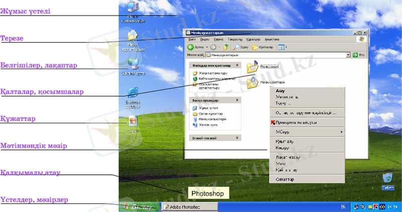 Стандартты көріністе Жұмыс үстелінде Менің компьютерім, Менің құжаттарым, Себет , Желілік орта, Internet Explorer терезелерінің таңбашалары, Тапсырмалар үстелі, Бастау батырмасы орналасқан.