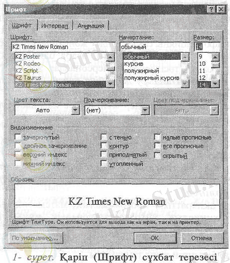 З. Пайда болған сұхбат терезенің Шрифт бетінде Қаріптің типін, сызылымын, көлемін жөне түсін тандап По умолчанию батырмасында шертіңіз. Пайда болған сұхбат терезеде Да батырмасымен бекітіңіз.