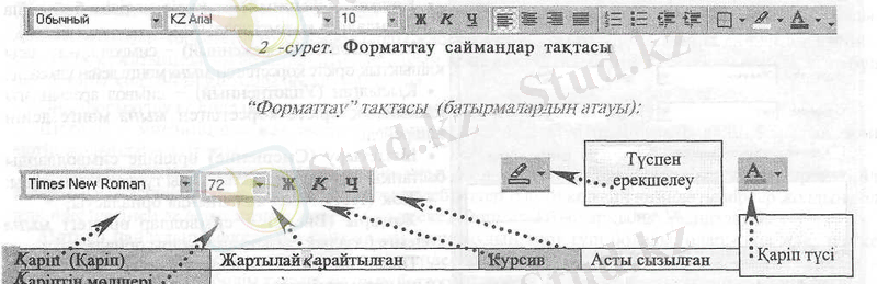 Символ қаріпінің параметрлерін Форматтау саймандар (2- сурет) тақтасымен де тағайындауға болады, мысалы: