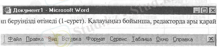 •Тақырып жолы -терезенің жоғарғы бөлігіндегі қатар. Онда құжат пен программаның өзінің аты және оң жақшетінде терезені басқару батырмалары - Орап қою (Свернуть), Қалпына келтіру (Восстановить), Жабу (Закрыть) орналасқан.