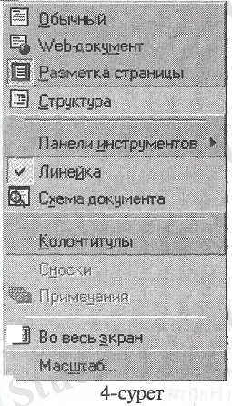 • Меню жолы -Word редакторының барлық командаларына қол жеткізеді. Ондағы әр пункт бір-бірлерімен байланысқан менюді ашады. Түр (Вид) менюін ашу үшін, оны тышқан тетігімен шертеміз. Сол кезде бізге құжатты экранда көрсету тәсілдерін орындайтын бірнеше командалар ұсынылады. Мұнда кейбір командалар солғын түспен көрсетлген, мысалы: сілтемелер (Сноски) және Ескертпелер (Примечания) (2-сурет) .