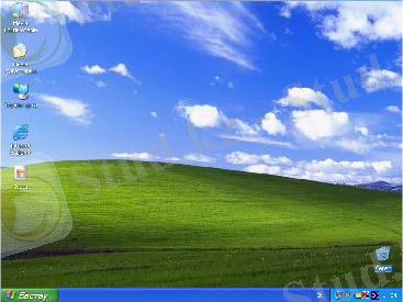 Стандартты көріністе Жұмыс үстелінде Менің компьютерім, Менің құжаттарым, Себет, Желілік орта, Internet Explorer терезелерінің таңбашалары, Тапсырмалар үстелі, Бастау батырмасы орналасқан.
