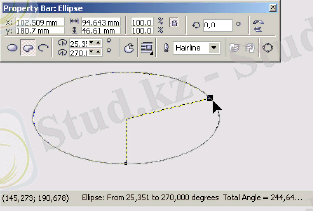 Осы әрекетті орындағаннан кейін тышқан батырмасын жіберсек, онда эллипс секторға айналады (2. 5. - сурет) . Эллипсті секторға түрлендіру арқылы эллипстің ішіндегі түйінге апарамыз. Егер эллипс түйінін оның ішіне емес, сыртына орналастырсақ, онда эллипстің секторы емес доғасы салынады.