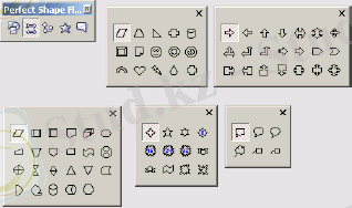 2. 9. - сурет. Perfect Shapes құралдар тақтасы және стандартты фигуралардың ішкі топшаларының палитрасы