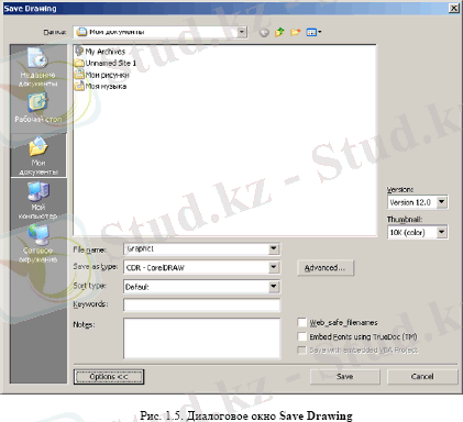 CorelDRAW құжаттарын сақтау стандартты саймандар тақтасындағы Save (Сохранить) командасы арқылы жүзеге асады. Егер құжат бұрынырақ жадыға сақталмаса, экранға сур. 1. 5. көрсетілген Save Drawing (Сохранить документ)
