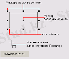 Тікбұрыш салу үшін тышқан көрсеткішін Rectangle (Прямоугольник) құралына апарып диагональ бойынша созу керек. Тышқанмен жылжытып болғаннан кейін оның батырмасын жібергенде, экранда тікбұрыштың жан-жақтарына жиектерін белгілеу және орталық маркері шығады. Ал қалып-күй қатарына тікбұрыш тобына жататын объекті белгіленді деген хабарлама шығады.