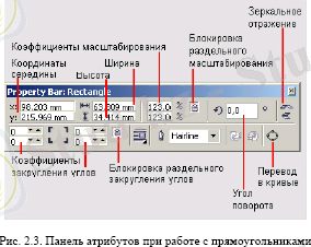 Тіктөртбұрыштардың атрибуттар құралы (2. 3. -сурет) мына қасиеттерден тұрады: төртбұрыштың өлшемін, төртбұрыштың орналасуын, масштаб коэффиценттерін және т. б. . бұл қасиеттер батырмаларды өзгертуге мүмкіндік береді. Сонымен бірге онда объектілермен жұмыс жасау батырмалары орналасқан (бұру, айналық бейнелеу, бұрыштарды дөңгелектеу және т. б. )