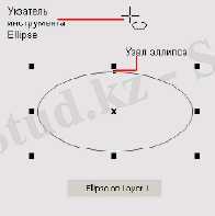 CorelDRAW программасында эллипстің өлшемі төртбұрыштың пішінінің (ерекшелендіру жақтауына сәйкес) өлшемімен анықталады. Ерекшелендіру жақтауындағы орынға маркердің 4 орта қабырғасы орналасқан эллипс берілген (2. 4-сурет) . Пайда болған эллипсте бар болғаны бір түйін ғана бар. Эллипс, рамка выделения, указатель инструмента Ellipse