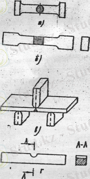 Пісірілген металдың соққы тұтқырлығын анықтау үшін ойықты арнайы үлгіні /4-сурет «г»/ маятникті тоқпақпен соққы күшін түсіріп сынайды.