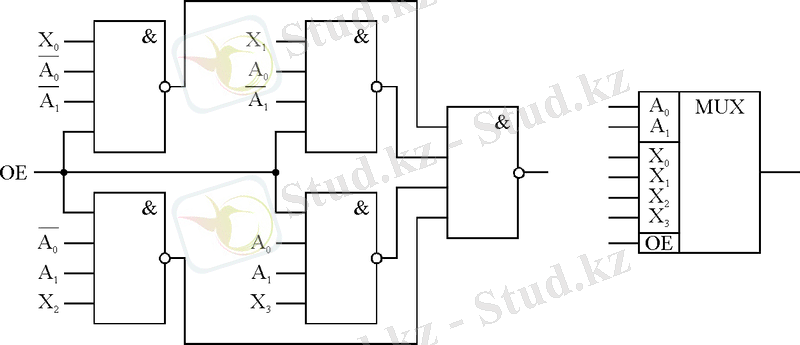 Мультиплексор сигналды тапсырады бірдің жалғыз Y шығуына Хi ақпараттық кірулерінен, және де кіру нөмірі екілік код ондық эквивалентіне бірдей адрестіктерді Аi. Кірулерінде егер ОЕ шығу рұқсат кіруі болса, онда «0» мына кіруде «0» енжар күй-жағдайға шығу тиісті ауыстыру. «4 в 1» мультиплексорды қарап шығамыз, бар болушы 4 ақпараттықтардың кіруді және log 4=2 адрестік кірулердің (сурет 5) . Х мөлшері қай мағыналар жасай алады. Сан кіріс өзгергіштердің бірдей 7, және шыншылдық кестесі 128 жол тиісті болу .