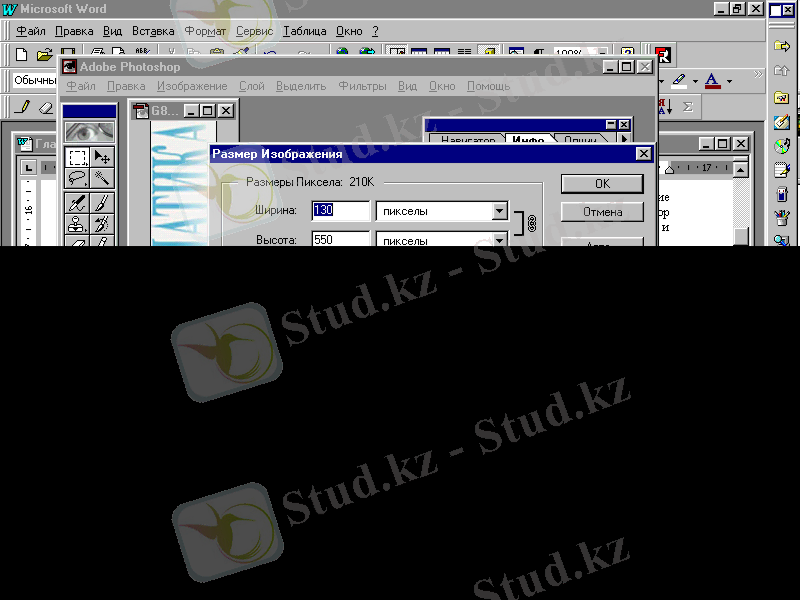 Бейнелер сипаттамасын Размер Изображения сұхбат терезесінде анықтап, өзгертуге болады, яғни аталған терезеге бассақ, онда экранда Изображение Размер изображения меню командалары көрінеді.