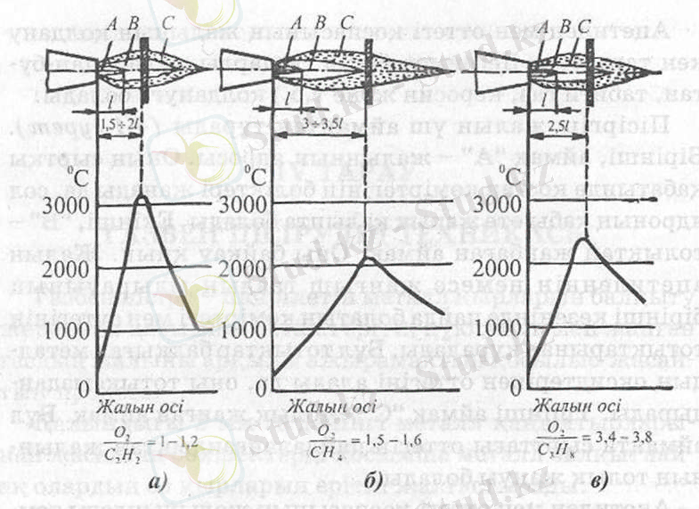 табиғи газ бен оттегі - 1, 5-1, 6 (1 б-сурет) ; пропан- бутан мен оттегі - 3, 4-3, 8 (1 в-сурет) .
