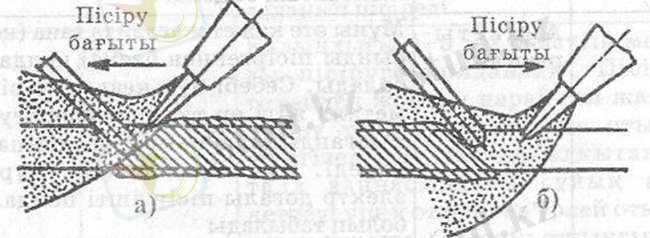 Пісіру тәсілі. Газбен пісірудің негізінен екі түрі сол және оң (6-сурет) тәсілдері болады. Сол жақпен пісіру кезінде (6 а-сурет) пісіруші оттықты оңнан солға қарай жылжытады, ал қоса пісірілетін металды жалын бетіне ұстайды. Пісірілетін металды жақсы қыздырып дұрыс балқыту үшін оттық пен қоса пісірілетін металды жікке көлденец иректеп қозғап отырады. Бұл тәсіл жұқа қаңылтырлармен оңай балқитын металдарды пісіргенде қолданылады.