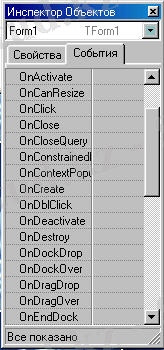 Әр обьектіге байланысты оқиғалар жеткілікті Мысалы, формаға - байланысты оқиғалар саны-35 (1. 4-сурет) . Олар қасиеттер терезесінің Events қосымша беті не енгізілген. Терезеде оқиға атауларының алдына On префіксі (қосымшасы) тіркестіріліп жазылған. Ол-атаудың оқиға екендігін білдіретін белгі.