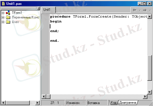 Жалпы ортада программа құруға арналған төртінші, модуль терезесі де іске қосылады( Unit1. pas ) . Форма терезесінің астында орналасатындықтан, ол алғашқыда көрінбейді.