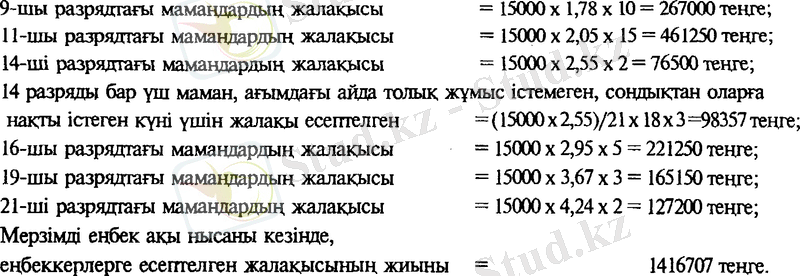 1-ші разрядтың мөлшерлемесін ұжымдық келісім-шартта 15000 теңге мөлшерінде бекіткен. Кәсіпорынның жұмыс тәртібі бойынша аптаның бес күнін жұмыс күні етіп белгілеген (ағымдағы айда 21 күн жұмыс күні болған) . Кәсіпорынның 14-ші разряды бар үш маманы ағымдағы айда 18-ақ күн жұмыс істеген.