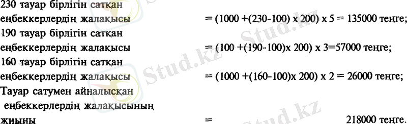 2. Кесімді-прогрессивтік төлем ақысының жүйесі. Сату бөлімінің он жұмыскеріне (еңбеккеріне) келесі еңбек ақы белгіленген: 100 тауар бірлігіне 1000 теңгеден және одан әрі сатылатын 100 тауар бірлігіне 200 теңгеден төленетін бес жұмыскері 230 тауар бірлігін, үш жұмыскері - 190 тауар бірлігін және екі жұмыскері - 160 тауар бірлігін сатқан.