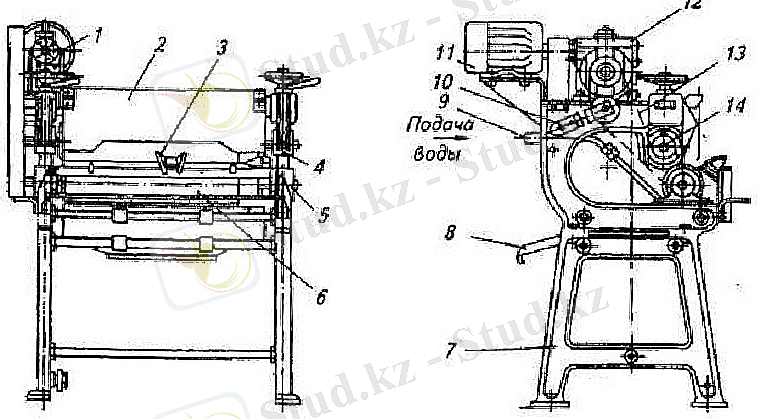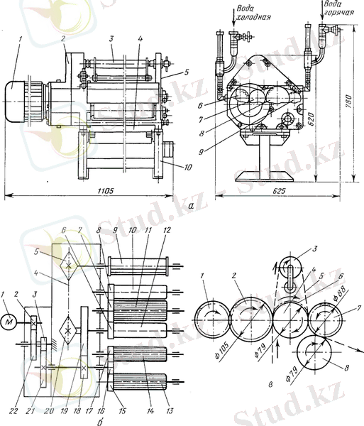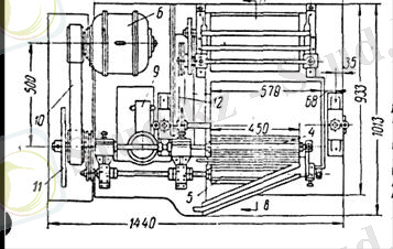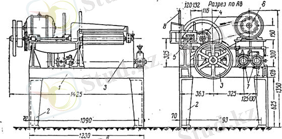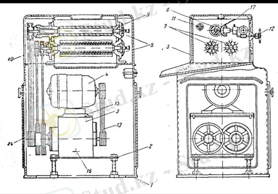 а) Машина тірек корпусына бекітілген қаңқадан 10, тіреулерден 5, редуктордан 2, қуаты 0, 6 кВт болатын электроқозғалтқыштан 1, екі тегіс 4, 7 және үш бұдырлы 6, 8, 9 резеңке біліктен тұрады. Машинаның үстіне 3 тегіс эксцентрлік болат білік орнатылған.