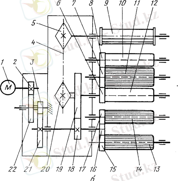 Тұрақты тіректерге 7 тегіс білік орнатылады, ал қалғандары реттеледі. 4 және 6 біліктер 7-8і біліктері арқылы қалыптасатын тазарту аймағы арқылы ішектерді тартады. 9 бұдырлы білік желдеткіш пішінді:ол суды шашыратып, іргелес біліктің бетін қабықшалардан тазартады. б) Барлық біліктерді 2-22 және 3-21 кезеңдерінде цилиндрлік беріліс қорабынан тұратын электроқозғалтқыш 1 басқарады. 16 және 18 шестерниялар беріліс қорабының шығыс білігіне орнатылған. 16 шестернядан 17 тісті дөңгелек арқылы тартқыш білікке 14 айналым жасайды, 13 бұдырлы білік, 15 тісті дөңгелек арқылы жүргізіледі. 18 шестерня арқылы қозғалыс біркелкі тарту білігіне 12 ауысады, ал одан 6 шестерня және 7, 8 дөңгелек тазарту білігіне 10 және 11ауысады . Эксцентрлік білік 9 айналмалы тізбектің 5 және 20 жұлдызша және 4 шынжыр тізбегінен тұрады. Ішкі аралықтағы босықшалар ілмектен енгізіледі. 7 және 8 тарту біліктерінің айналмалы жылдамдықтары және 4 тіреуіш 0, 064 м / с құрайды. Тазалау білігіндегі 2 айналмалы жылдамдық ішектің қозғалуына бағытталған және 0, 55 м / с тең, бұл қабықтарды алып тастауға мүмкіндік береді. Желдеткіш білігінің жылдамдығы 10, 46 м / с құрайды. Шошқа ішегі 6 екі жұп роллер арасында өтеді, ал қой ішегі қозғалтқышты білікте 3, содан кейін тартылған білікті тазалаудан кейін 7 және 8 жіберіледі. Машинаның өнімділігі 1 сағат ішінде 170 шошқаға дейін, 1 сағаттағы қой етінің өнімділігі - 125 цесса болады.