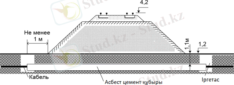 Құбырларды бөгет арқылы төсеу, әдеттегідей, кабельді қиылысу аймағындағы өсеуден бұрын орындалады. Кабельдердің темір жолдарды қиылысқан кезде үйме табасының ені 35 м аспайтын жер таңдап алынады (табан жанындағы үйменің ені: қосжолды теміржол үшін 3Н+10, біржолды темір жол үшін3Н+6 м, мұндағы, Н - рельс бастиегінің және үйме табанының биіктік белгілерінің айырмасына тең) . (3. 2-сурет)
