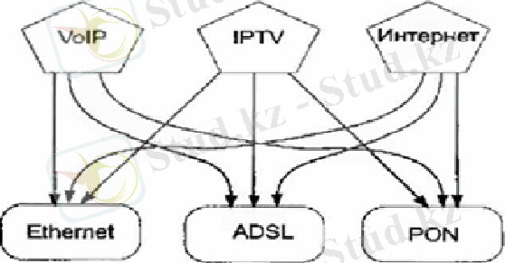 Triple Play тұжырымдамасында «триада» қызметі абоненттік қолжеткізу желісі түрінен тәуелсәз болуы қажет. Триада қызметінің бірдей түрі (мәлімет, сөз, видео) Ethernet үй желісіне тиене алады, ADSL абоненттік желісі немесе FTTx/PON оптикалық жүйесі (сурет 1. 2) де. Бұл жағдайда, пайдалану және қызмет көрсету ережесінің принциптері бірдей болуы тиіс. IP негізінде бірегей мәліметті тарату ортасын құрып, NGN технологиясы қатынау желісінің түрлі араластыру және кез-келген желі арқылы Triple Play қызметтерінің барлық тізімін қамтамасыз етуге мүмкіндік береді .