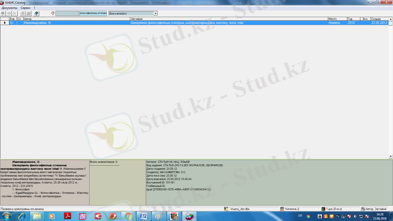 Әл-Фараби атындағы ҚазҰУ Ғылыми кітапханасындағы өндірістік тәжірибе: КАБИС және Ирбис ақпараттық жүйелерін қолдану (30.05-15.06.2016)