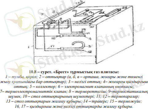 Плита (10. 8-сурет) пісіру орны бар тумба қораптан тұрады. Қорап ақ эмальмен қапталған жҧқа болат қабықшалардан тұратын жапсарланған элементтерден тұрады. Плита атмосфералық түрлердегі әртүрлі жылу қуаттылығы бар төрт оттықтан тұрады. Пісіру қорабында төменгі негізгі және жоғары қосымша (қыздырғыш) екі оттық орналасқан. Пісіру қорабындағы екі оттықтардың жұмысын 2 - термоэлектромагниттік клапан мен 8 - термореттегіш ретке келтіреді. Бұл қондырғылар 9 - термостатикалық шүмекке қосылған.