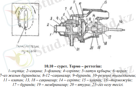 11 - клапанмен газдың берілуі 7 - винт арқылы аздап берілетін газды толтыра отырып, негізгі оттықтың жұмысын жандандыра түседі. 11 - клапанның ашылып жабылуы автоматты түрде терможүйе, мембраналар мен серіппе (10. 9 - сурет) арқылы іске асырылады.