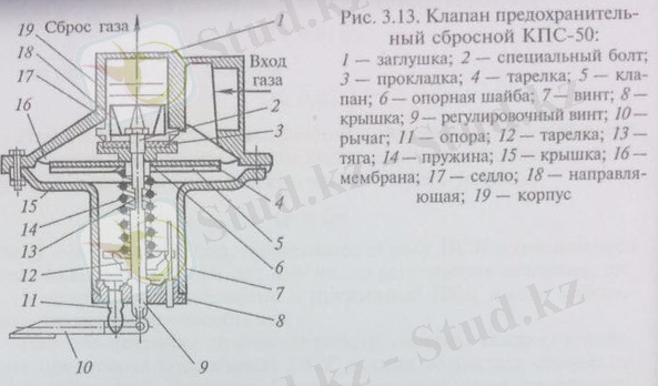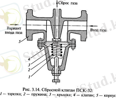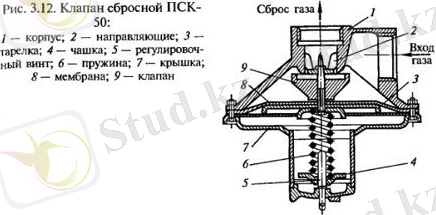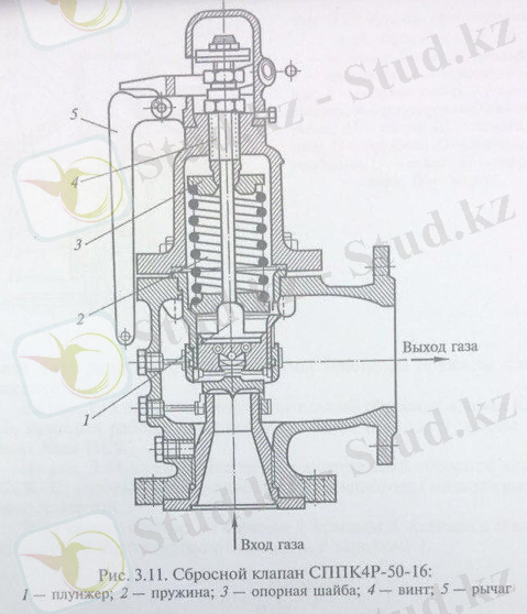 3. 11 суретте жоғары және орта қысымды газ құбырларында орнатылатын сақтандырғыш арнайы толық көтерілмелі серіппелі бақылап үрлеуге арналған тетігі бар клапан көрсетілген. Мұндай клапанның кіру келте құбыры газқұбырының реттегіштен кейінгі бақыланатын учаскесімен біріктірілген. Клапан корпусында тоқымға серіппемен қысылған плунжер орнатылған, оның күші бұранданың айналу барысында тірек шайбаның қозғалуымен реттеледі.