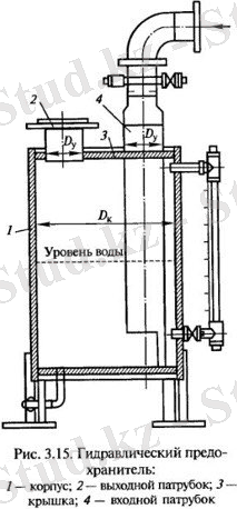 Гидравликалық сақтандырғыш (3. 15-сурет) корпустан 1 және екі фланецті кіру 4 және шығу 2 келте құбырынан тұрады. Кіру келте құбырының фланеці газ құбырының бақыланатын учаскесімен жалғанған. Кіру келте құбырының төменгі бөлігі кесілген шеті түбіне жетпейтіндей етіп қақпақ арқылы корпусқа түсірілген. Корпус тиектік сұйықтықпен толтырылған.