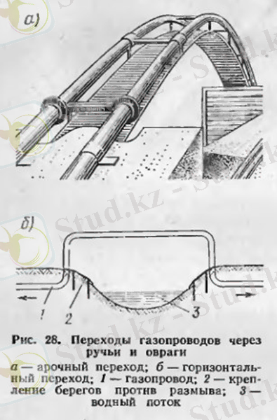 Соңғы уақыттарда газ құбырлары кішігірім өзендер мен ағындармен, жыралармен қиылысқан кезде аркалы (а-сур) немесе көлденең (б-сур) өткелдер қолданылады. Мұндай өткелдерде құбырларды көтергіш конструкция ретінде пайдаланылады. Аркалы өткелдер екі газ құбыр желісін салу кезінде ыңғайлы болып келеді. Аркалы өткелдерде жағалау тіректерін мұқият қадағалау керек.