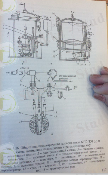 Тамақ дайындауға арналған газ қазандары. Тамақ пісіретін қазандық СТГ-250 (сур. 4. 16) ыстық тағам, тұздықтар және гарнир дайындау үшін арналған, ол пісіру қазандықтан, корпустан, бу генераторынан, газ жандырғыш құрылғыдан және автоматика құрылғысынан тұрады.