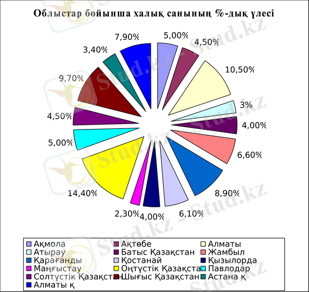 Қазақстан республикасы халқының саны өзінің алып жатқан аумағына сәйкес емес, яғни бізде көптеген себептерге байланысты халық саны төменгі көрсеткішке ие болып отыр. Қазақстан жер аумағы үлкен болғанымен халық сирек қоныстанған елге жатады. Қазақстанда орта есеппен 1 шаршы км-ге 5, 7 адамнан келеді. Республика халқы аумақ бойынша біркелкі орналаспаған. Басым көпшілігі (43, 4 %) Қазақстанның оңтүстігінде шоғырланған, ал солтүстікте - 24 % ғана орналасқан. Ең жоғарғы халық санының тығыздығы Оңтүстік Қазақстанда: 1 шаршы км-ге 9, 1 адамнан келеді. Солтүстік өңірлерде халық тығыздығының көрсеткіші - 6, 4 адамнан, Шығыс Қазақстанда орташа көрсеткіш 5, 1 адамнан, Республика бойынша ең төменгі көрсеткіш батыс облыстарда - 2, 8 адамнан және орталықта - 3, 1 адамнан келеді.