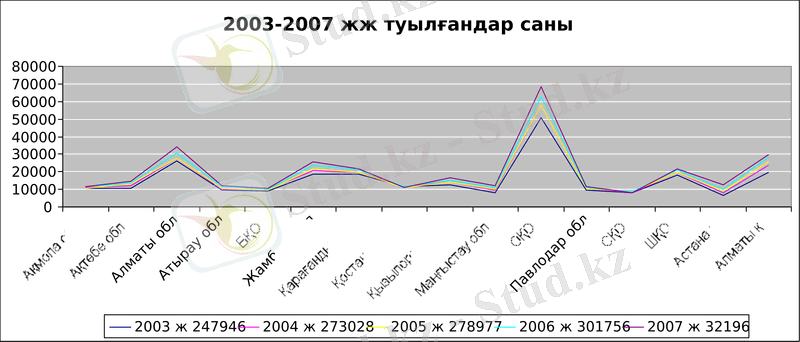 Жалпы Қазақстан бойынша туу саны өлім санынан 1, 5 есе артық көрсеткішке ие. Республика аумақтарында халықтың табиғи өсуі байқалады. 2005 жылы халықтың табиғи өсу коэффициенті 1000 адамға 8 адамнан келеді.