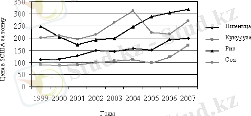 1- суретте көрсетілгендей, бидай, күріш, жүгері дақылдарының бағасы жылдар бойында артып отыр, тек сояның бағасы 2004 жылдан 2006 жыл аралығында екі есеге дейін төмендеп, тек 2007 жылы бірден жоғарылаған.