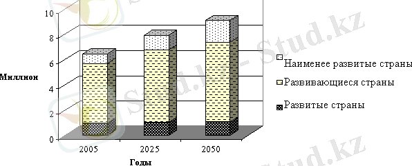 2-суретте 2005 жылғы халық саны және 2025жыл мен 2050 жылдардағы халық санының өзгеруіне болжам жасалған.