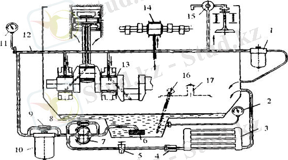 1. 1-суретте осындай құрама майлау жүйесінің принципиалдық схемасы көрсетілген. Оның жалпы құрылысы мен жұмысы мына төмендегіше болады. Майлайтын сұйық (көбінесе двигательдік майлар) картер түбіне құйылып қойылады. Оның деңгейі белгілі бір мөлшерде болуға тиіс және оны арнаулы көрсеткішпен (16) үнемі бақылап отырады. Енді осы картер түбіндегі май арнаулы сүзгімен жабдықталған қабылдағыш (6) арқылы май насосымен (7) сорылып алынады да қысыммен әрі қарай сүзгілерге (1, 10) жіберіледі.